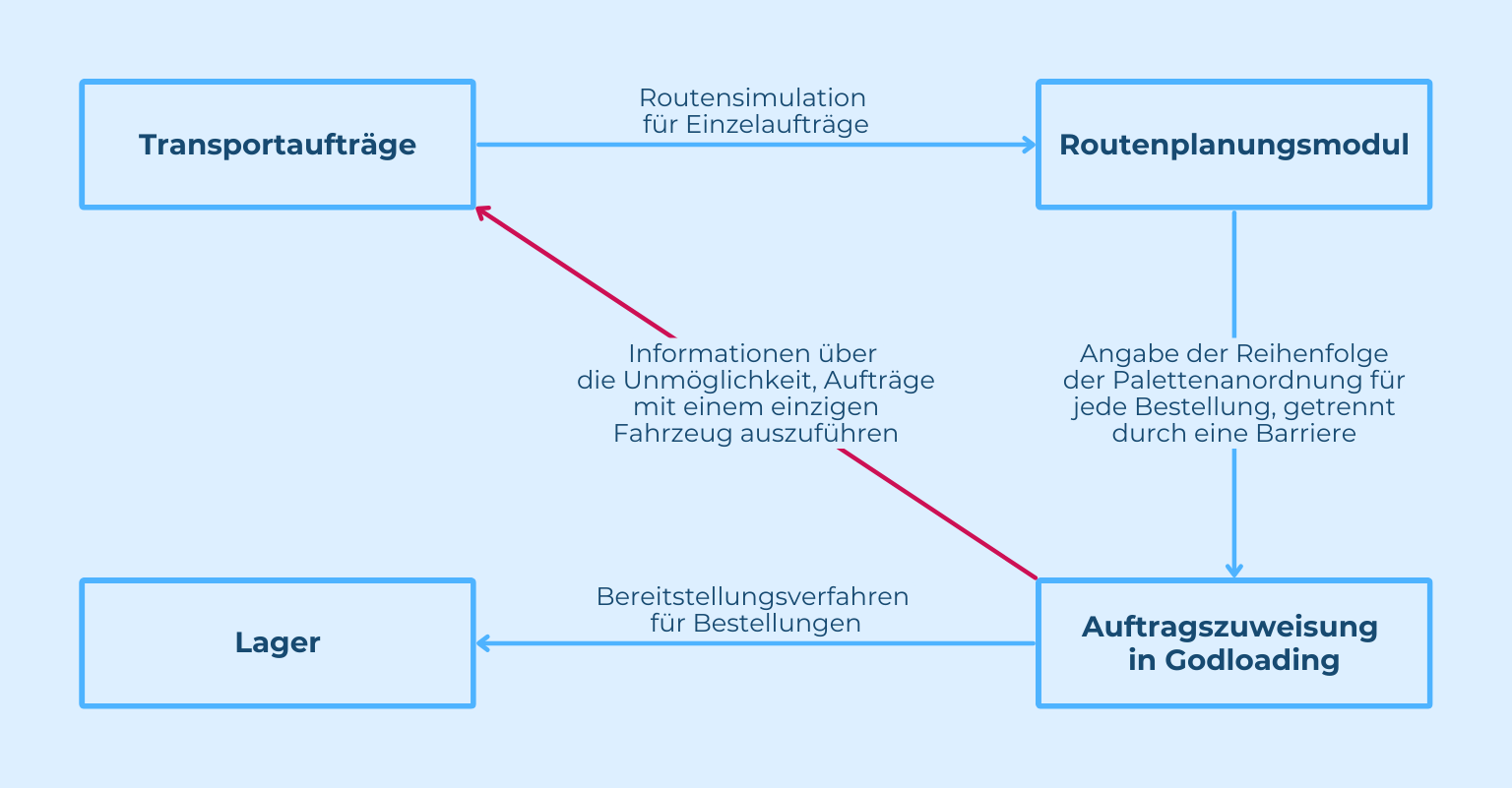 - Erhalt eines fertigen Ladeplans für alle Aufträge in einem Fahrzeug oder Informationen über die Unfähigkeit, alle Aufträge in einem einzigen Transport auszuführen.