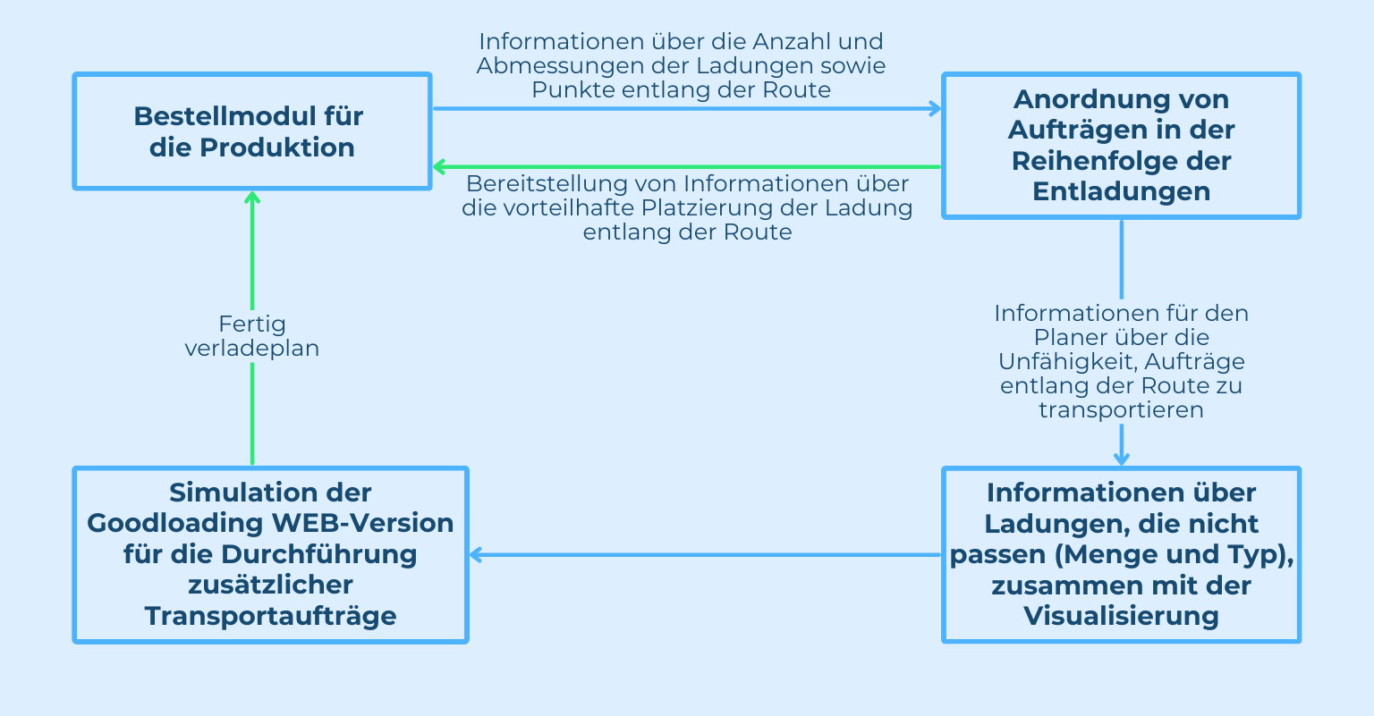 - Der Kunde sendet Informationen, die Daten über den Sattelauflieger, Abmessungen, Anzahl und Gewicht der Ladung sowie die Sequenz der Entladepunkte für die vorgesehenen Paletten enthalten.