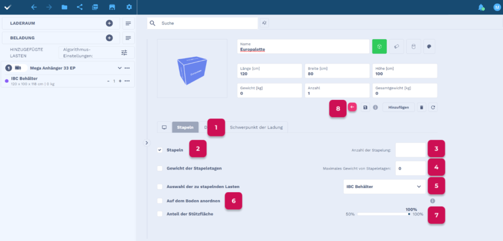 - Wenn die Ladungen übereinander stehen können, gehen Sie in den Reiter Stapeln.