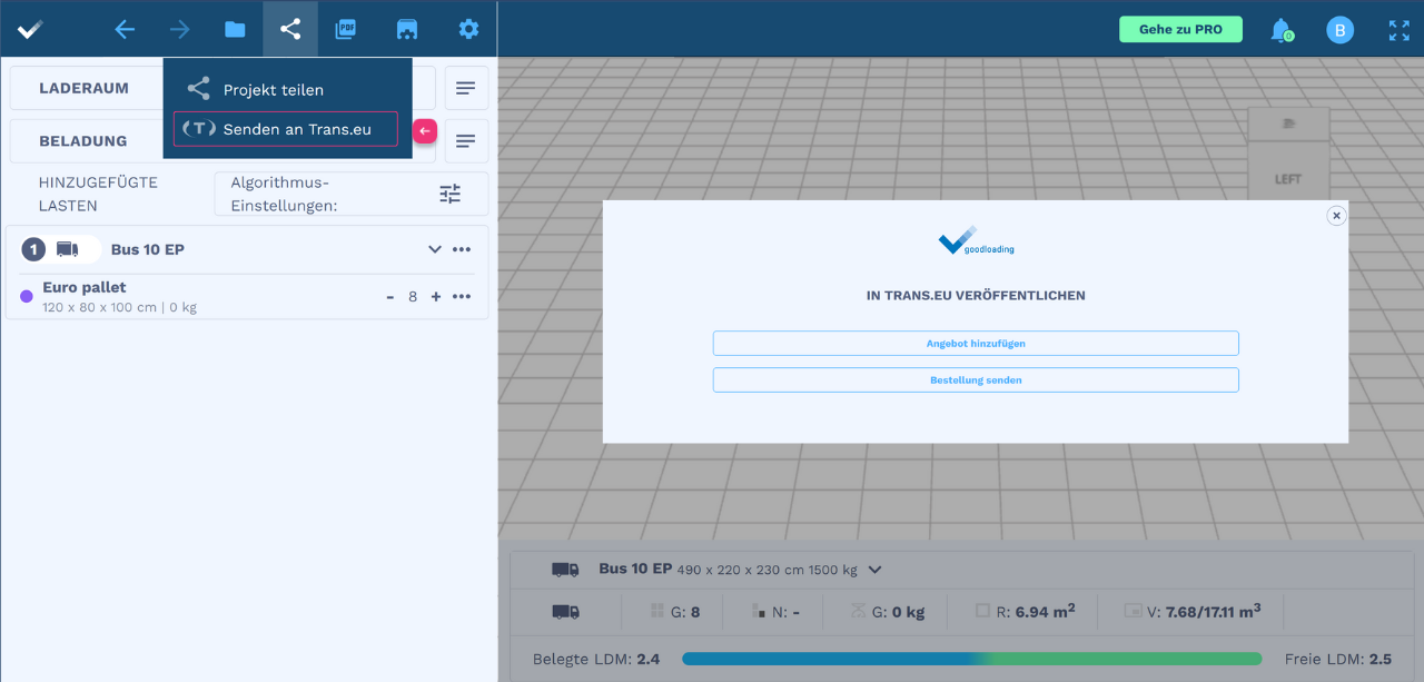 Klicken Sie dazu auf das Projektsymbol für die Freigabe und dann auf „Send to Trans.eu“. Sie sehen ein Fenster, in dem Sie auswählen können, ob Sie ein Angebot hinzufügen oder einen Auftrag senden möchten. Sobald Sie alle erforderlichen Daten ausgefüllt haben, wird Ihr Angebot oder Auftrag automatisch auf der Trans.eu Plattform veröffentlicht.
