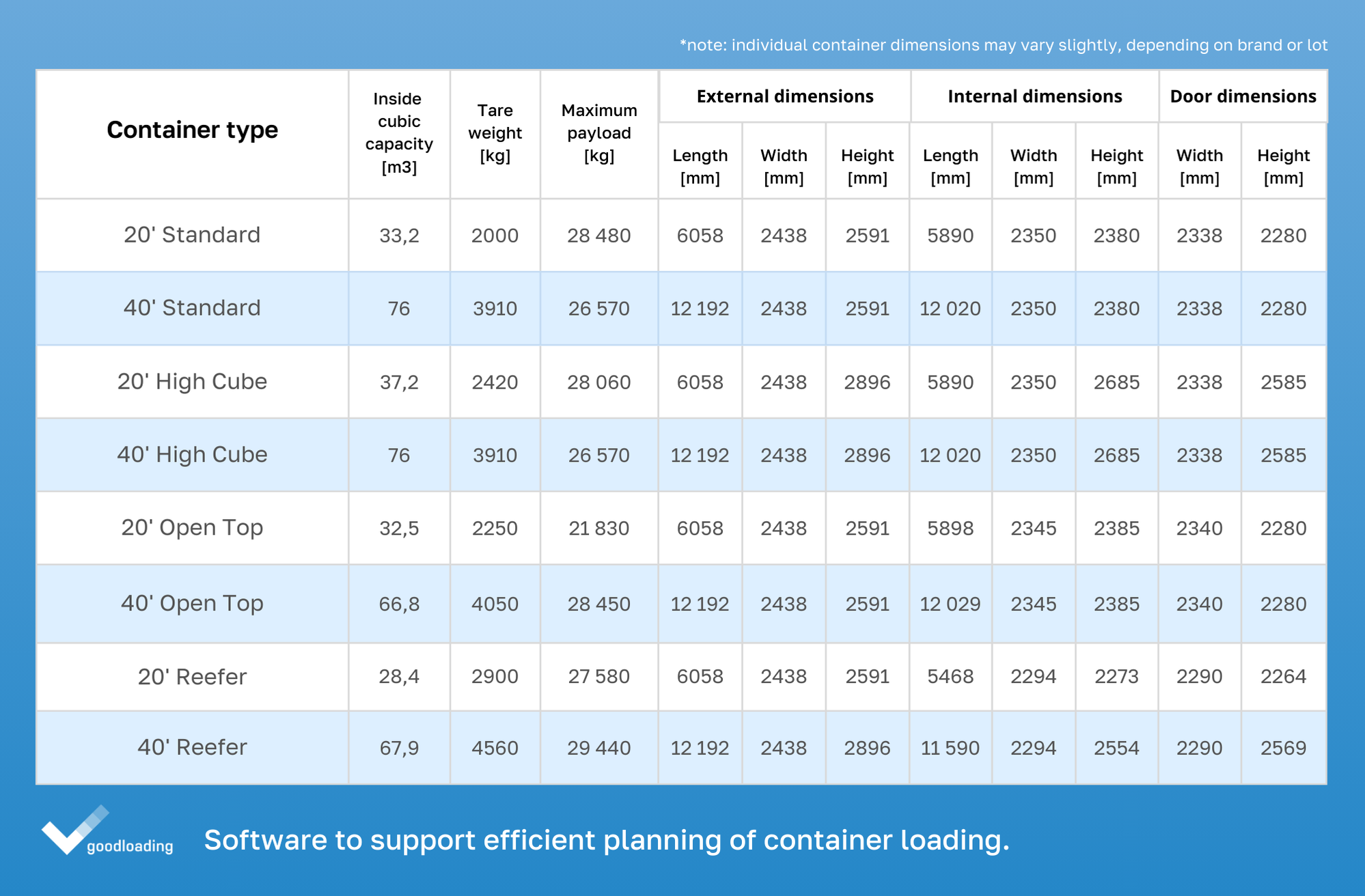 When planning the loading, the internal dimensions of the container as well as the size of the doors are taken into account. These are key parameters for determining the maximum quantity and size of cargo that can be loaded into a container.