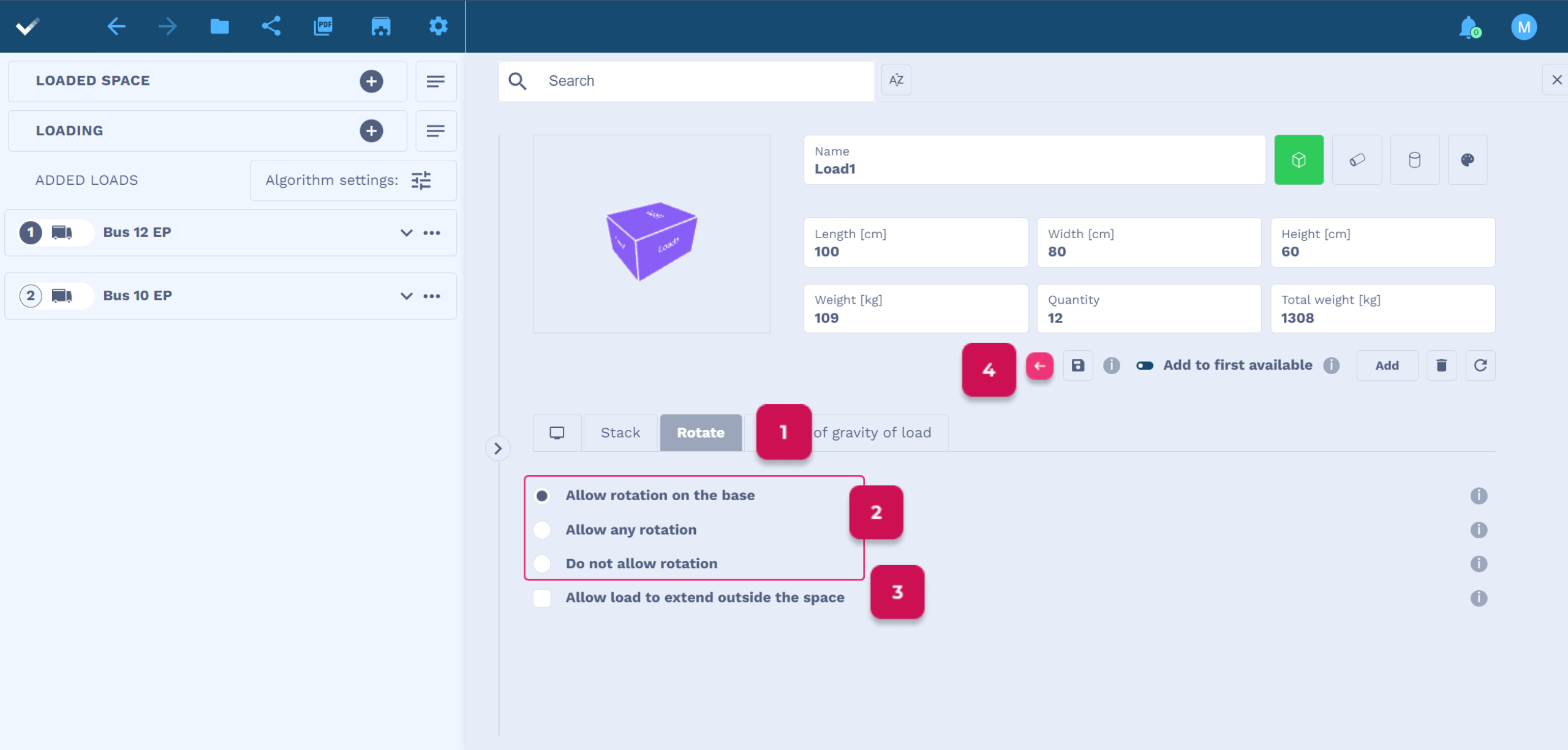 By default, all loads added to the application can rotate on their base. This means that the algorithm will rotate certain loads if it determines that it will optimize the usage of the loading space.