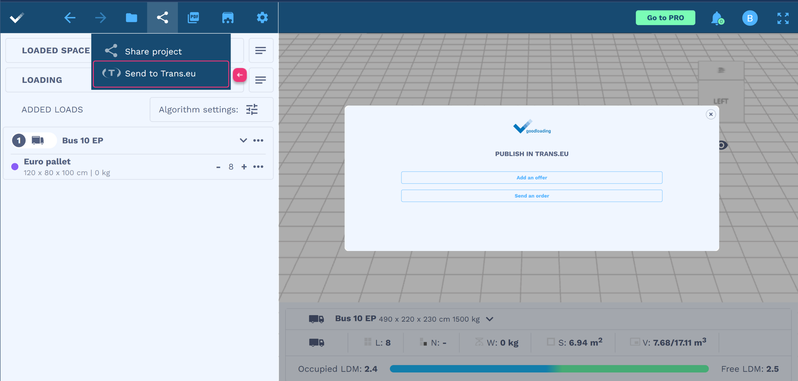 To do this, click the project sharing icon, then click “Send to Trans.eu”. You will see a window where you can choose whether to add an offer or send an order. Once you fill in all the required data, your offer or order will be automatically published on the Trans.eu platform.