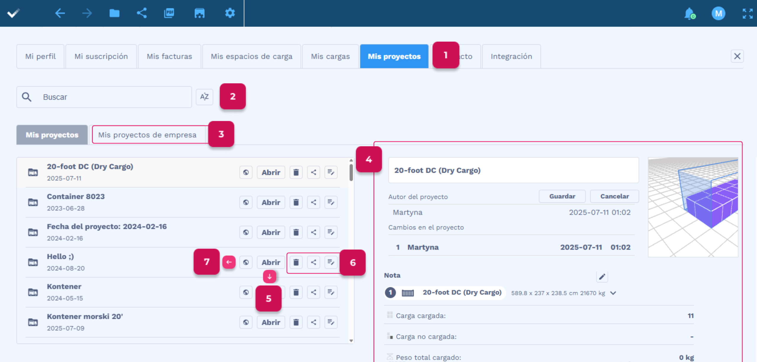 - Después de hacer clic en el nombre del proyecto seleccionado, en la parte derecha de la pantalla aparece una visualización y datos detallados de la carga. Si el proyecto ha sido compartido con alguien y esa persona ha realizado cambios en él, esto será visible en el historial.