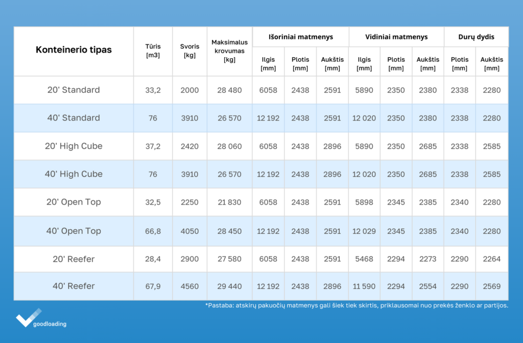 Planuojant konteinerio pakrovimą, atsižvelgiama į vidinius konteinerio matmenis bei durų dydį. Tai esminiai parametrai, pagal kuriuos nustatomas maksimalus krovinių, kuriuos galima pakrauti į tam tikrą konteinerį, kiekis ir dydis.