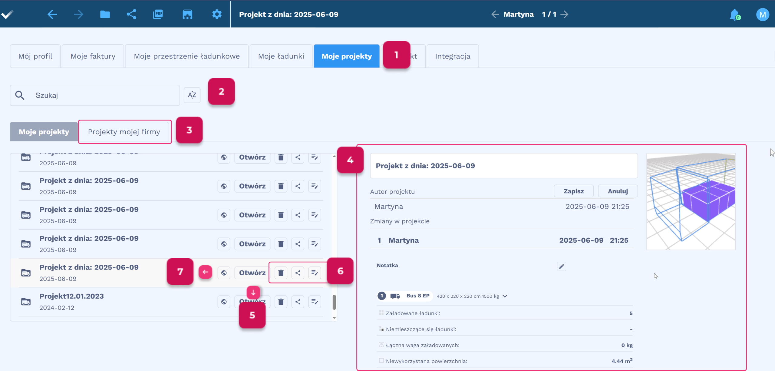4. Po kliknięciu w nazwę wybranego projektu, po prawej stronie ekranu pojawia się wizualizacja oraz szczegółowe dane o załadunku. Jeśli projekt został komuś udostępniony, a osoba ta wprowadziła w nim zmiany, to widoczne będzie to w historii.