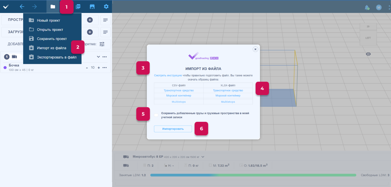 - После нажатия откроется окно, в котором можно загрузить файл с грузами. Для каждого типа грузового пространства доступен отдельный файл и инструкции.