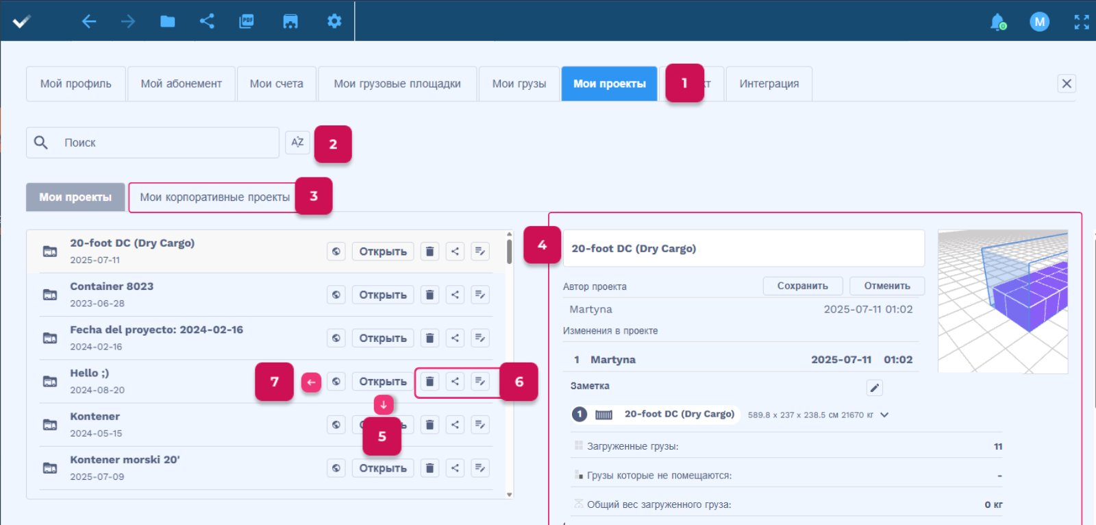 - Значок глобуса позволяет поделиться проектом, сохранённым в аккаунте пользователя, на вкладке ‘Проекты моей компании’, делая его видимым для других членов команды.