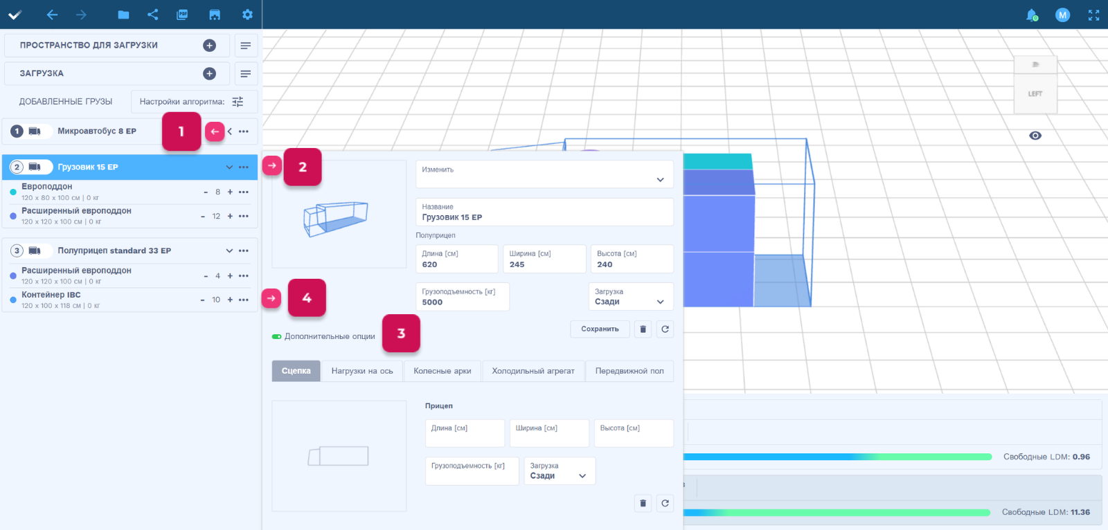 3. При нажатии на Дополнительные опции развернется расширенное редактирование грузового пространства.
