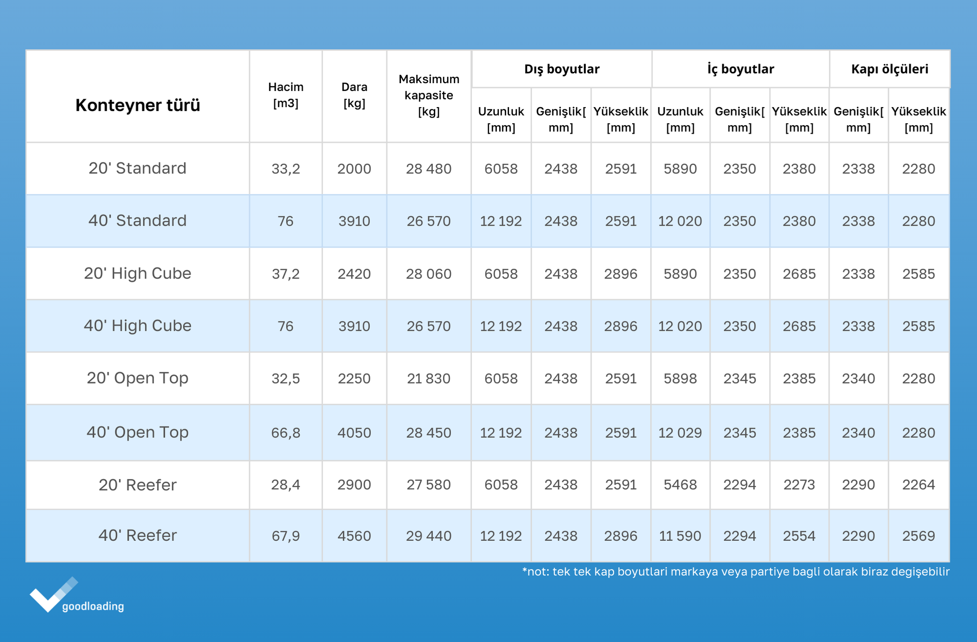 Yükleme planlanırken kapıların ölçüsü kadar konteynerin iç ölçüleri de dikkate alınır. Bunlar, bir konteynere yüklenebilecek maksimum kargo miktarını ve boyutunu belirlemek için anahtar parametrelerdir.